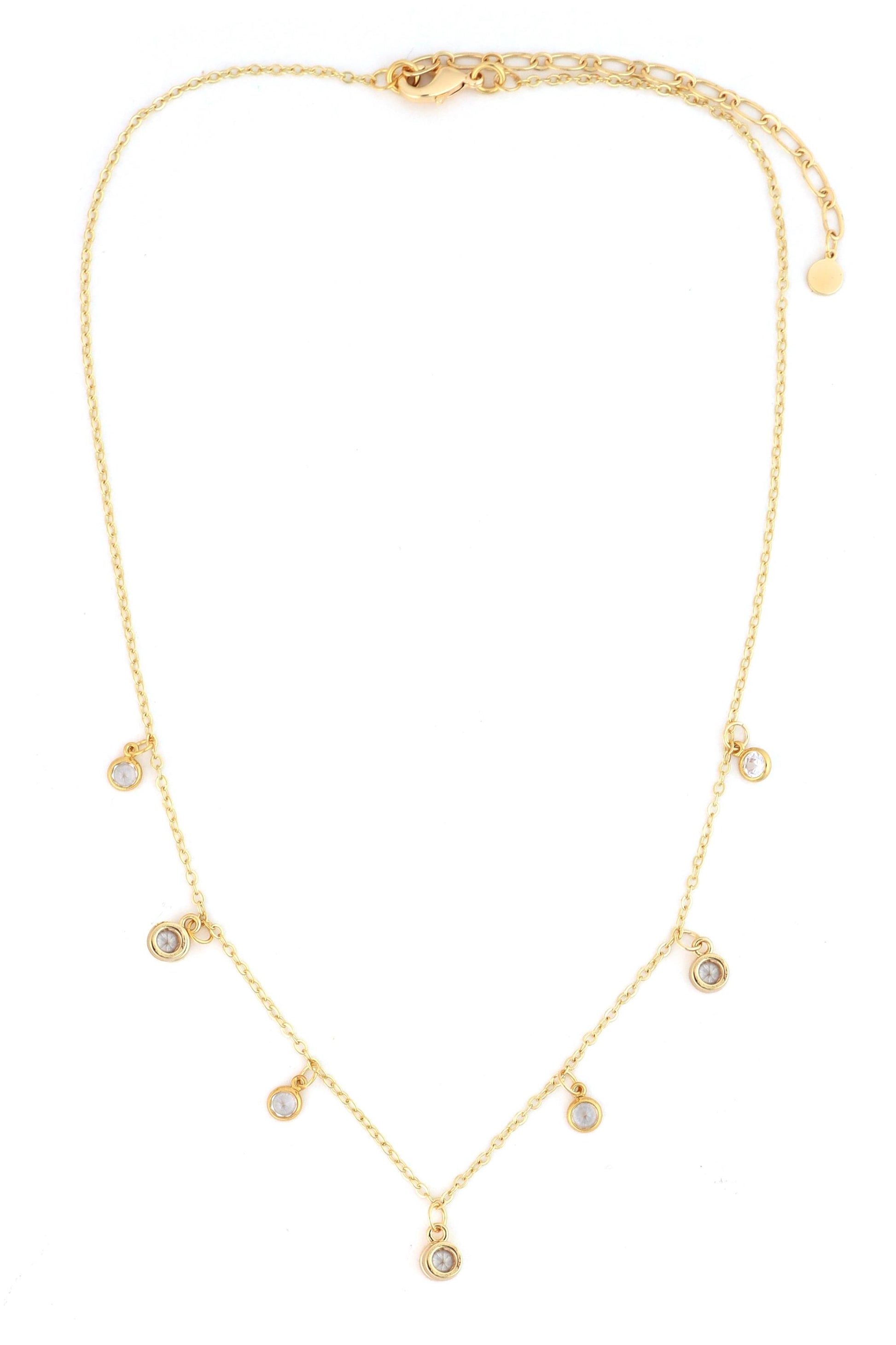 - Gold crystal micro charm necklace gold crystal micro charm necklace is made with a gold chain and mini clear crystal charms hanging throughout with a lobster claw closure and extender.