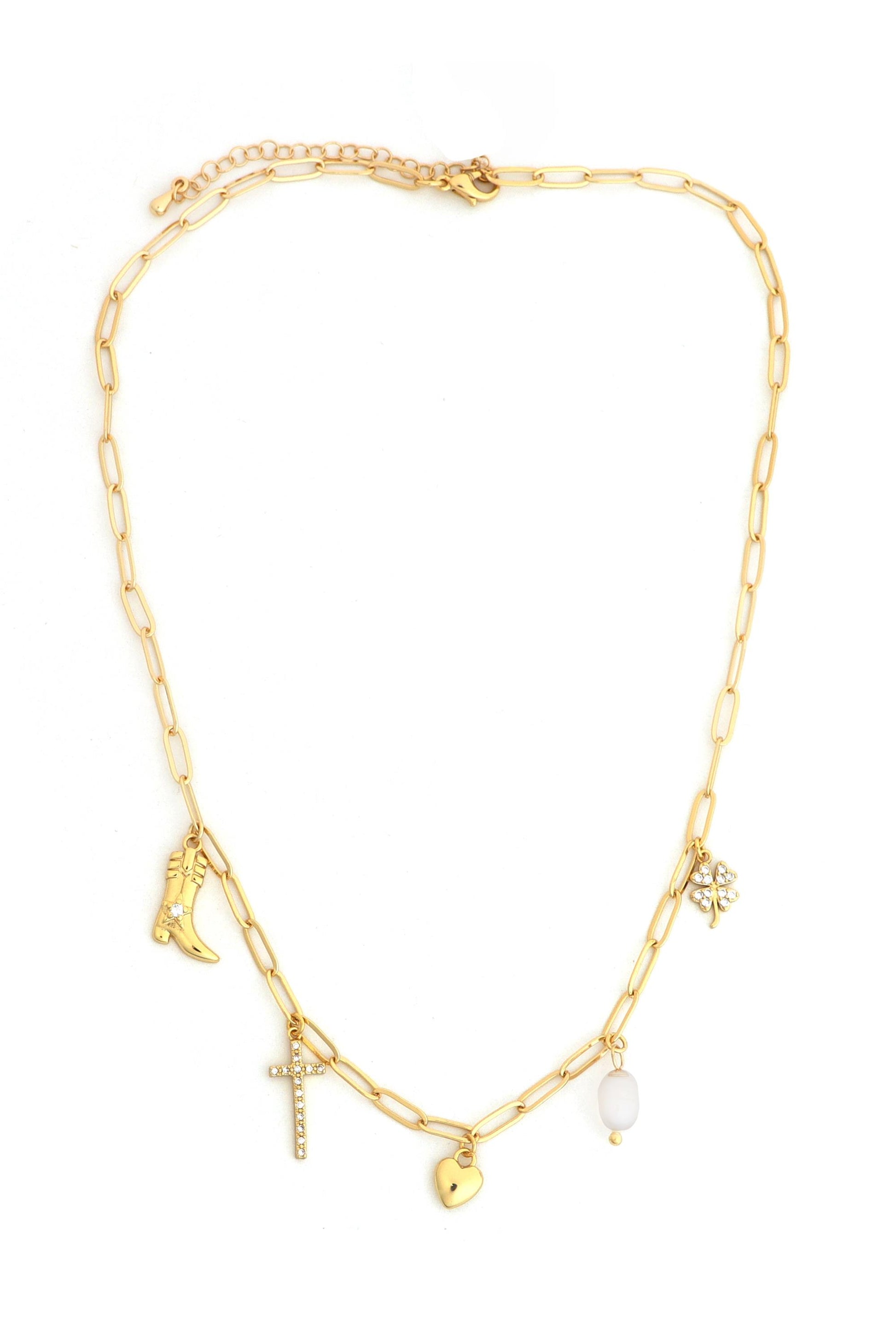 - Western charm necklace is made with a gold link chain and western inspired charms with a lobster claw closure and extender.