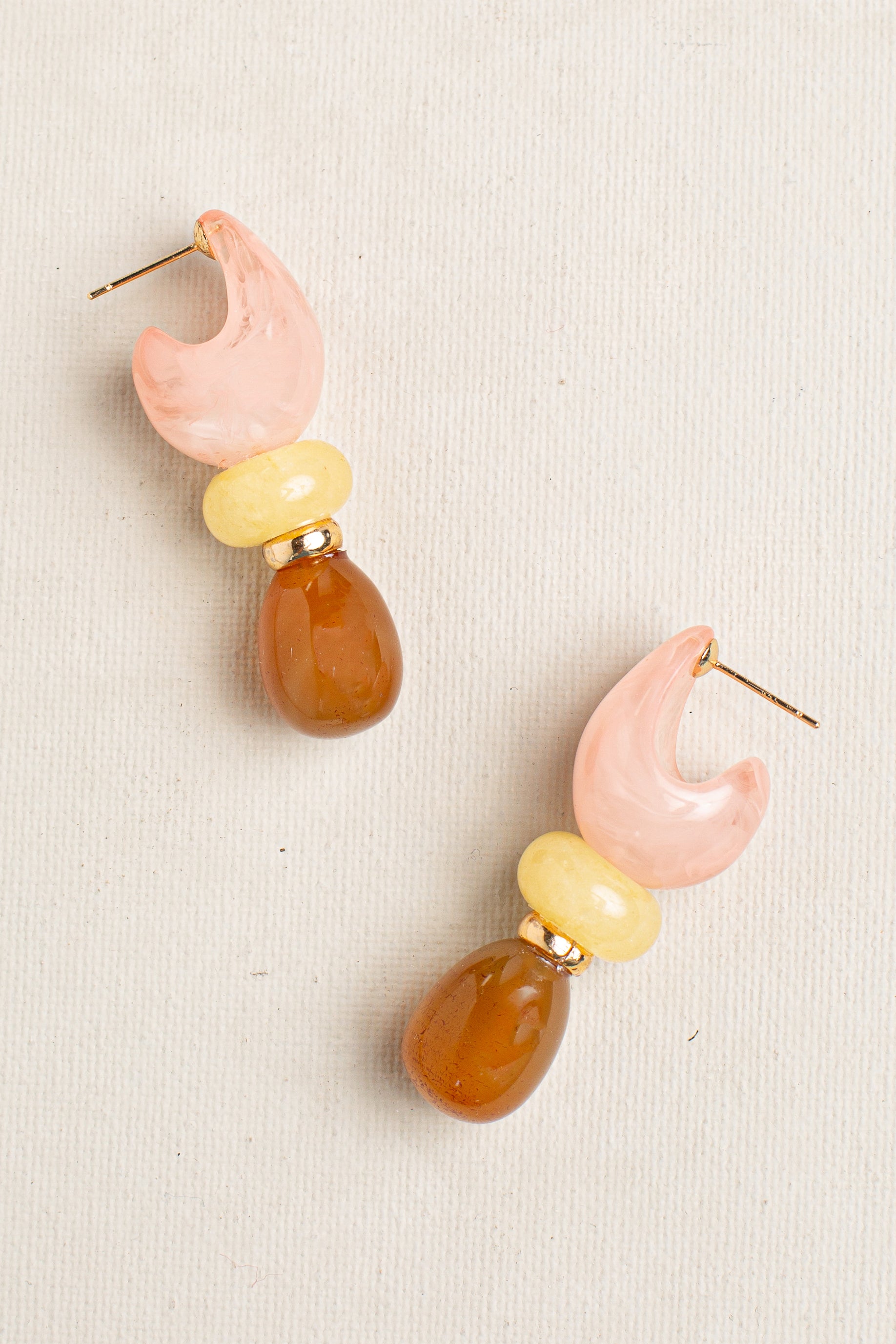 Elegant, self-assured, and vibrant. Discover the understated elegance of orange resin, yellow jade, and agate earrings.