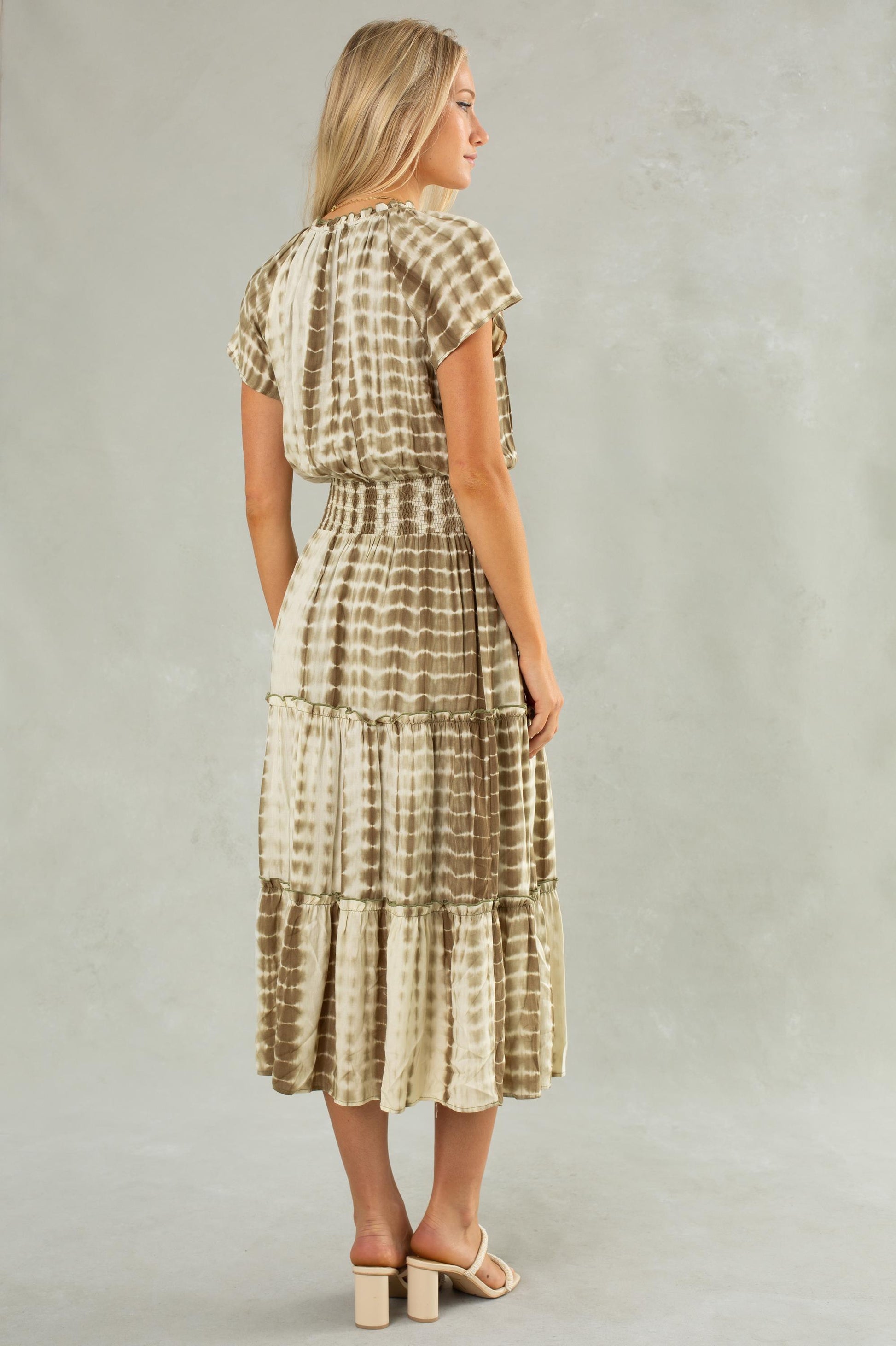 - This midi dress features an olive and cream tie-dye print, short sleeves, and a V-neckline.