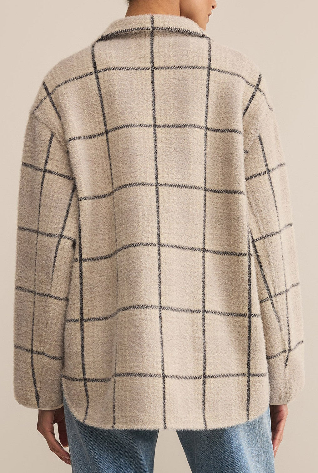 - When you want cozy and cool, this oversized plaid sweater-knit jacket has your back. Designed with dropped shoulders, welt pockets, and that plush, snuggle-worthy texture.