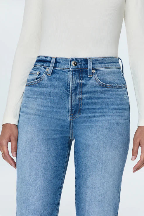 - High rise, figure hugging waist that falls to a slim-straight leg silhouette with a cropped, clean finished hem. Crafted from our signature comfort stretch denim for an expert fit and feel. Rhythm Vintage is a classic medium blue denim wash with moderate fading and whiskering and clean finishes.