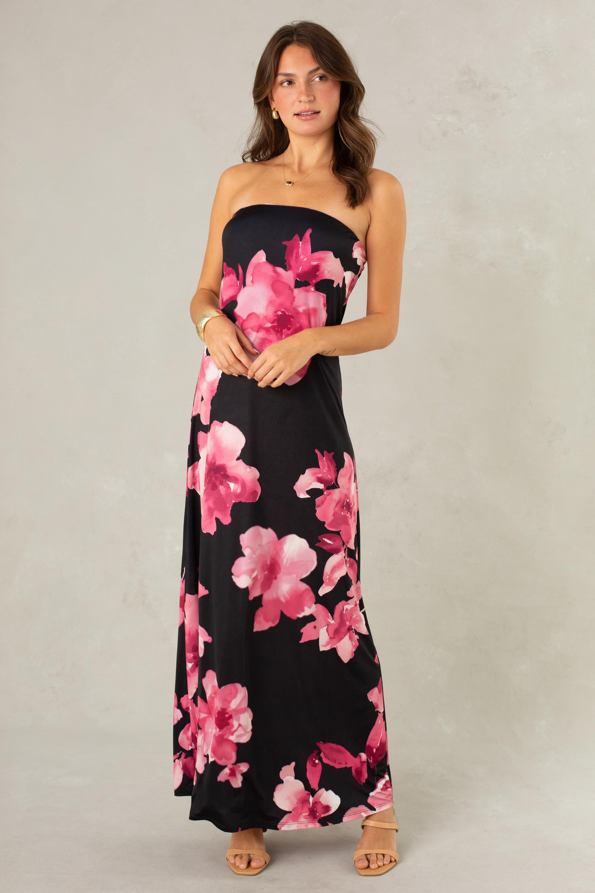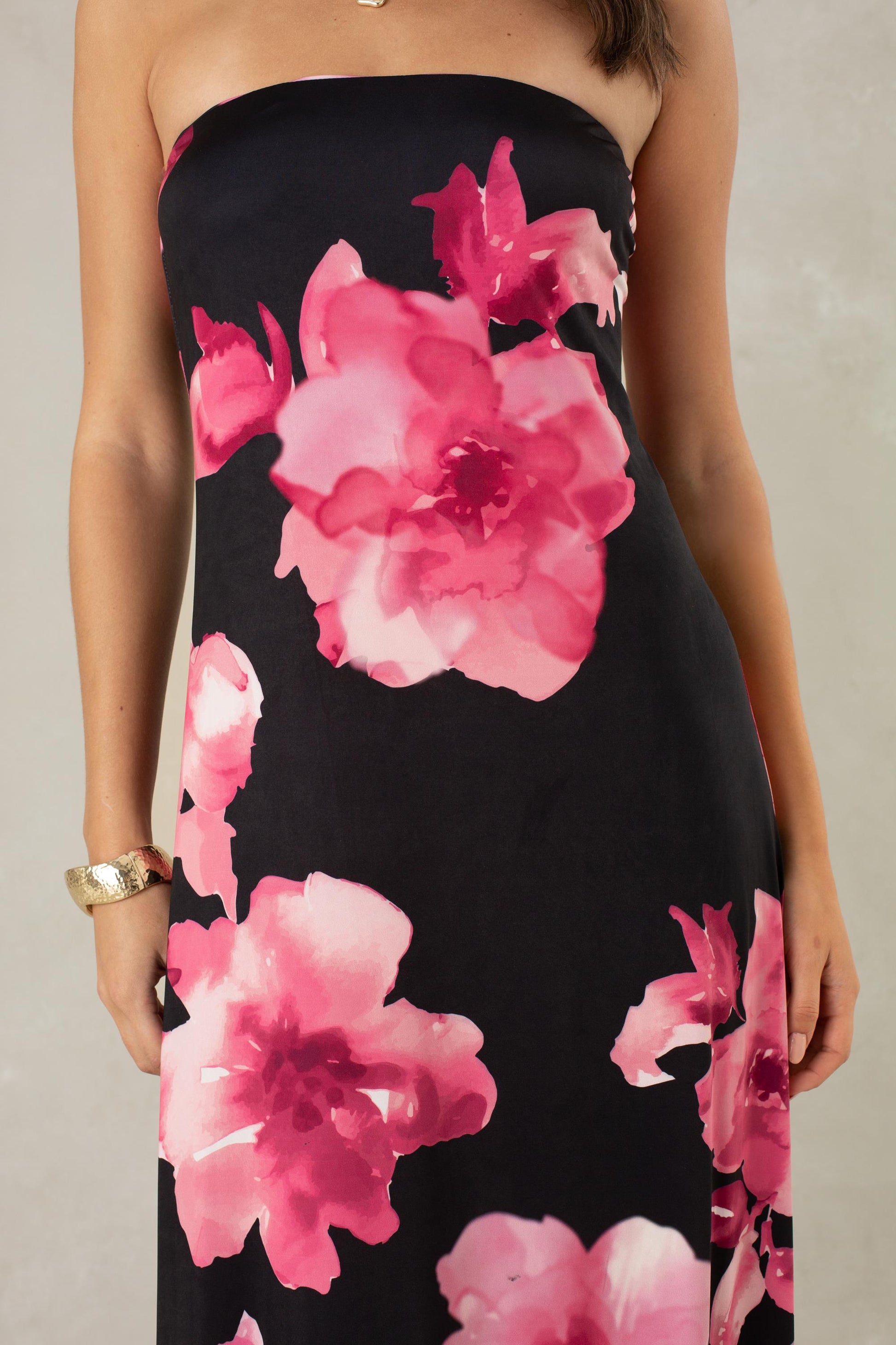 - The dress has a deep black base fabric, which provides a dramatic contrast to the large, stylized pink floral print. The flowers are rendered in various shades of pink, ranging from a vivid fuchsia to softer light pink and mauve, giving them a watercolor or painterly effect.