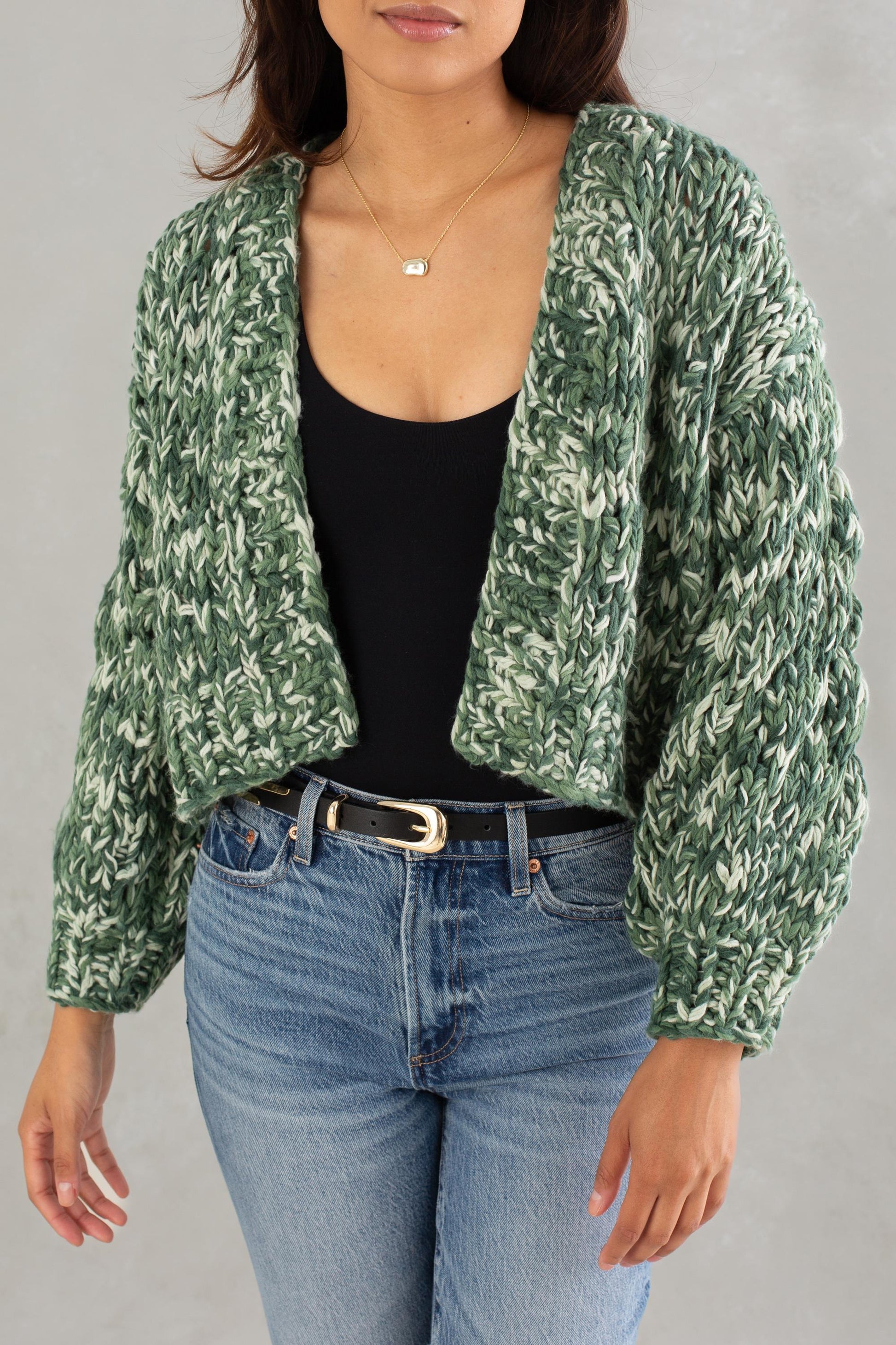 - It's a cozy, hip-length cardigan with a high round neck and raglan sleeves