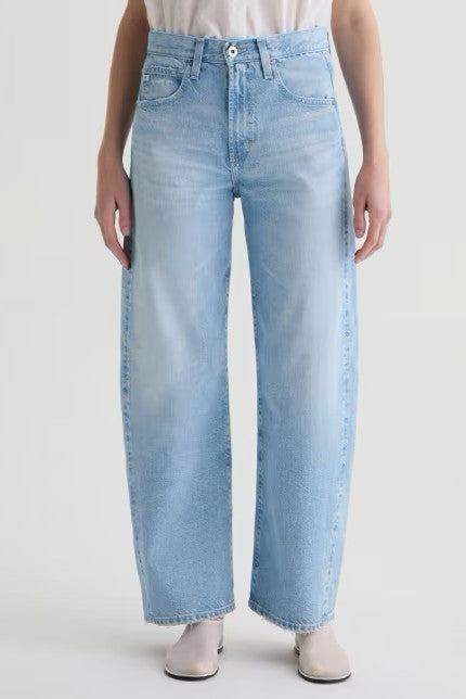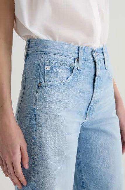 The Hattie is a high-rise barrel jean with a 28” inseam and ankle-grazing frayed hems. Made from 12 oz. Drapey Ridged Denim in a light wash, this style offers a structured look with a comfortable stretch feel.