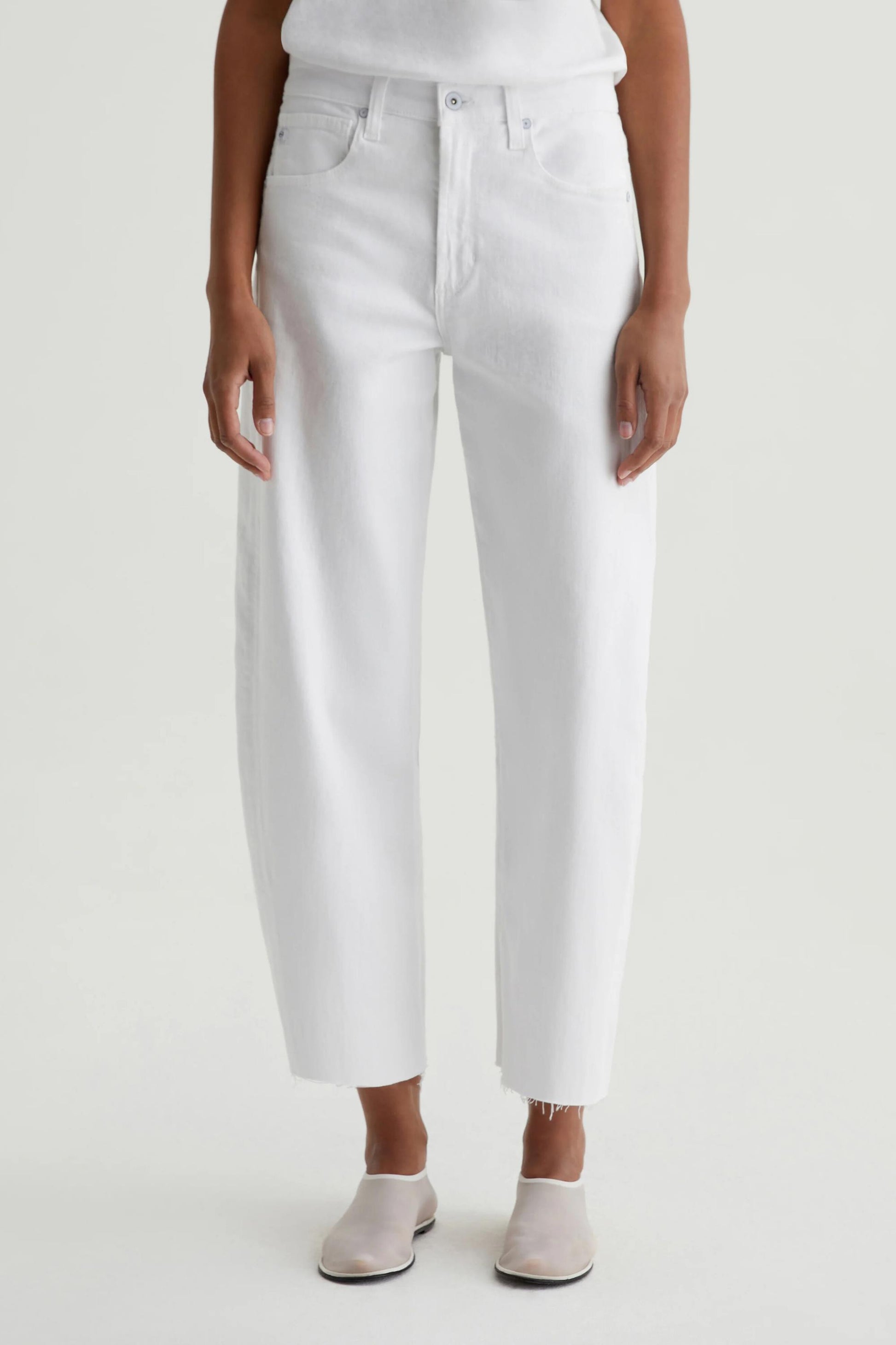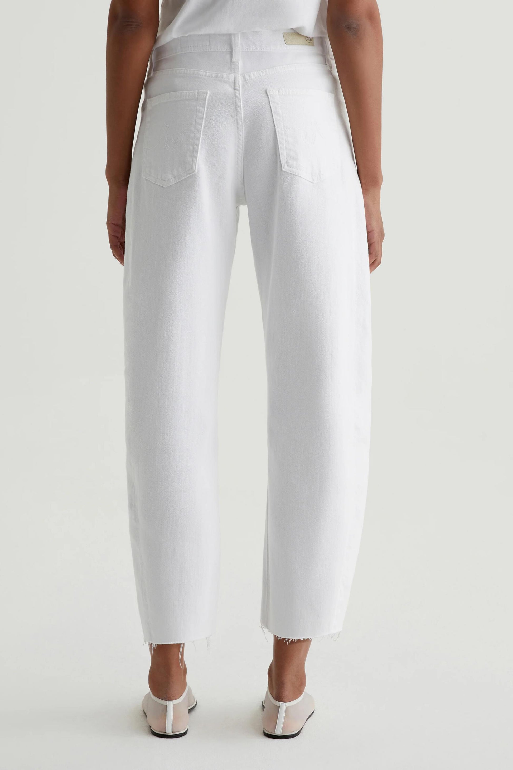 The Hattie Crop has an ultra-high waist and a curved shape at the legs, complete with side-seam paneling and raw hems that land above the ankle