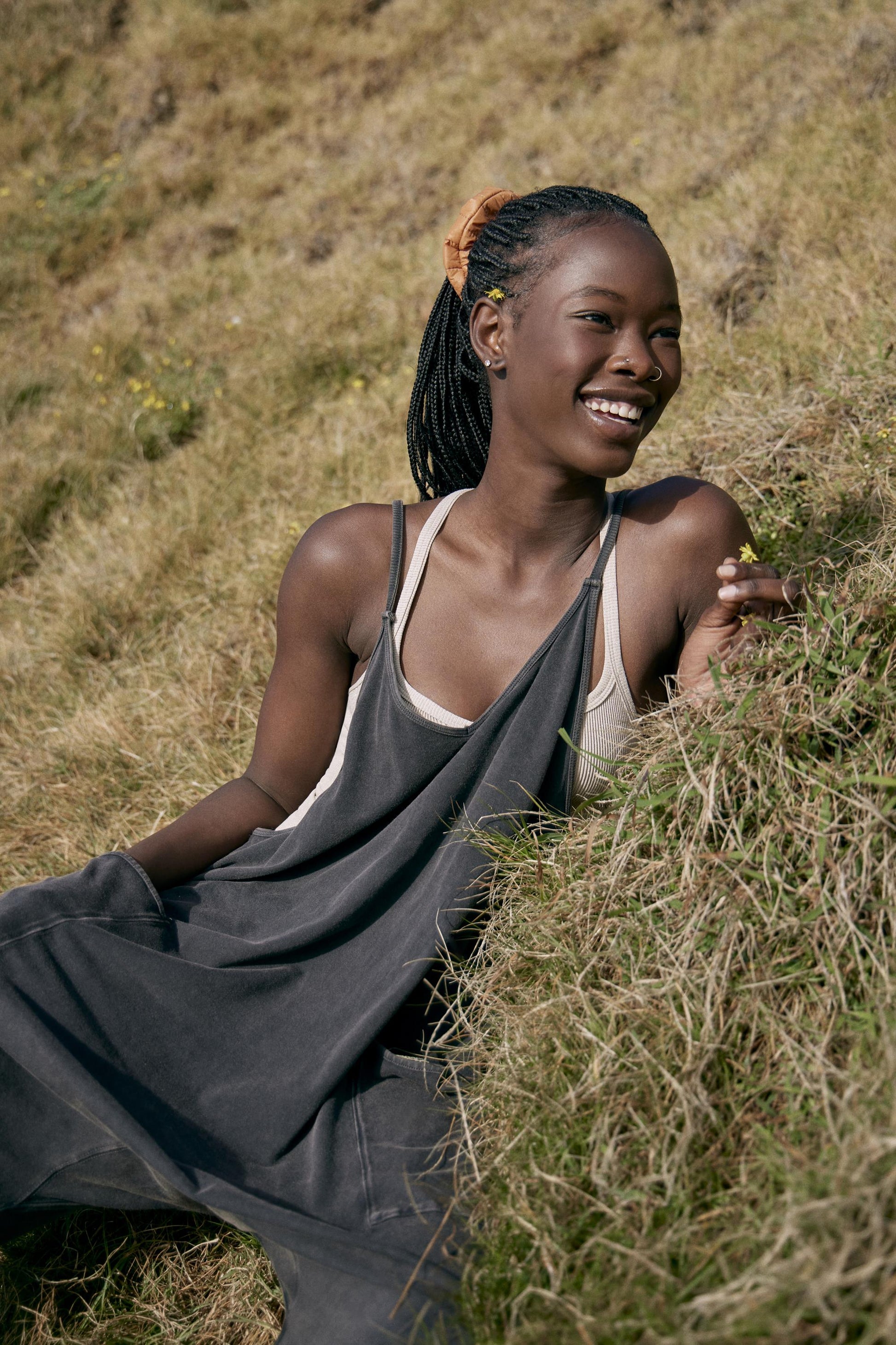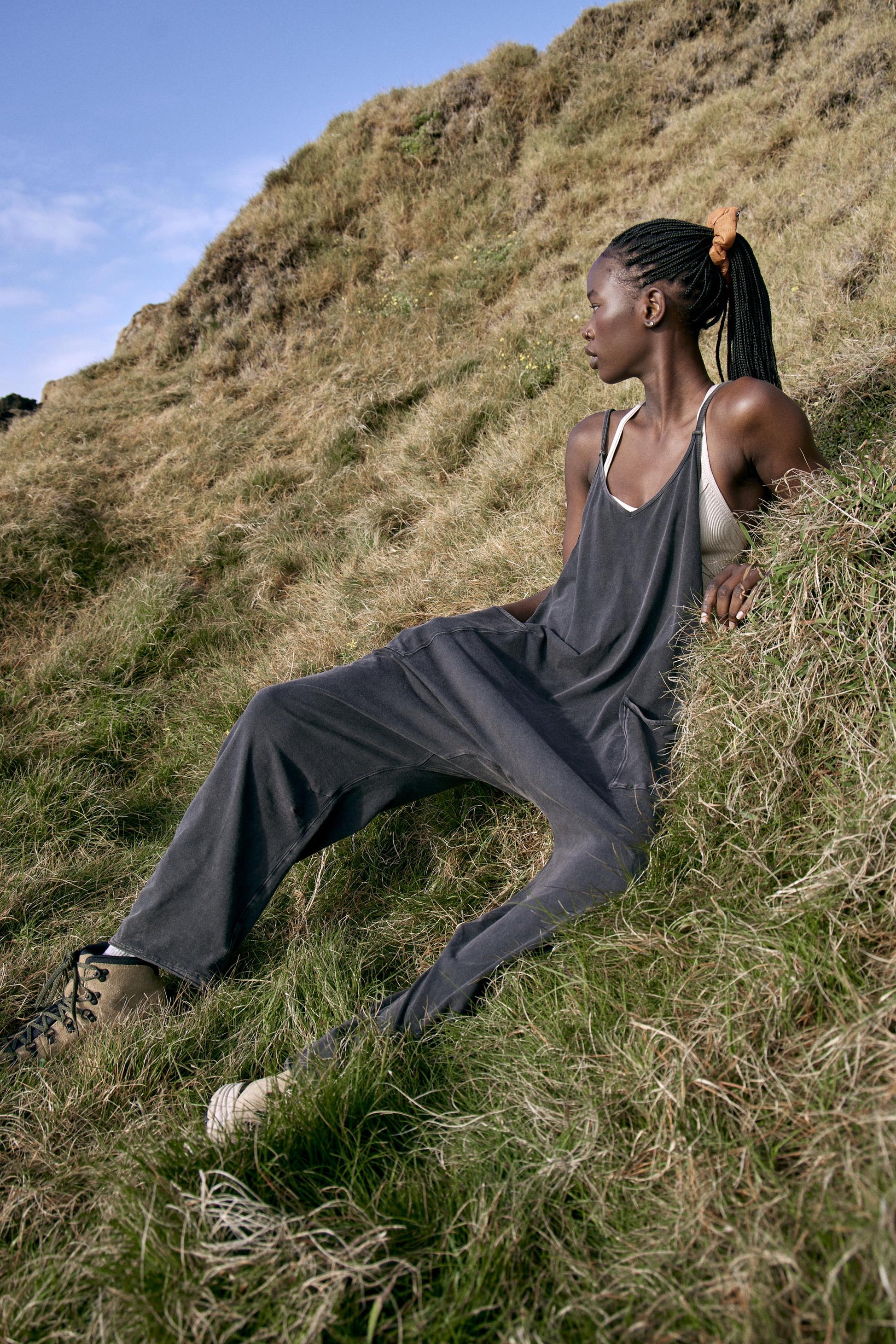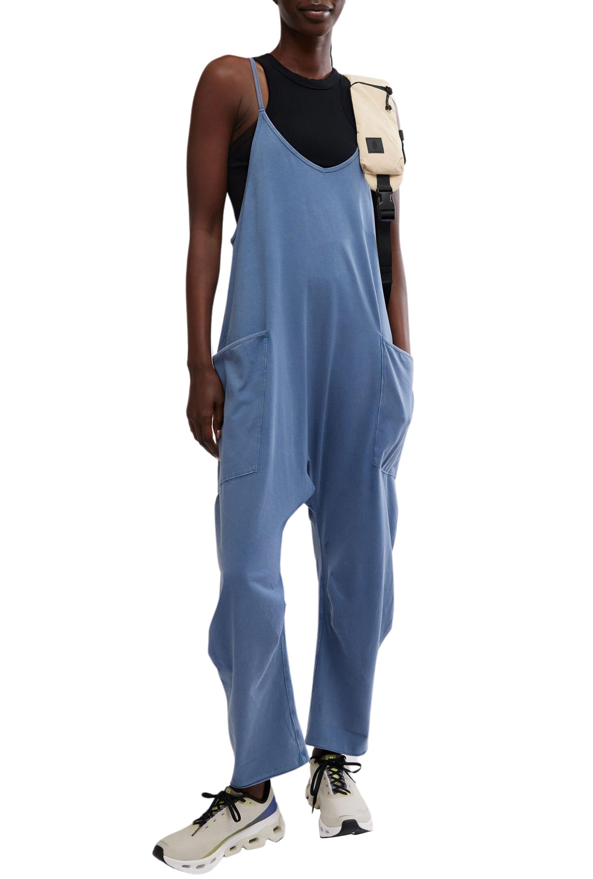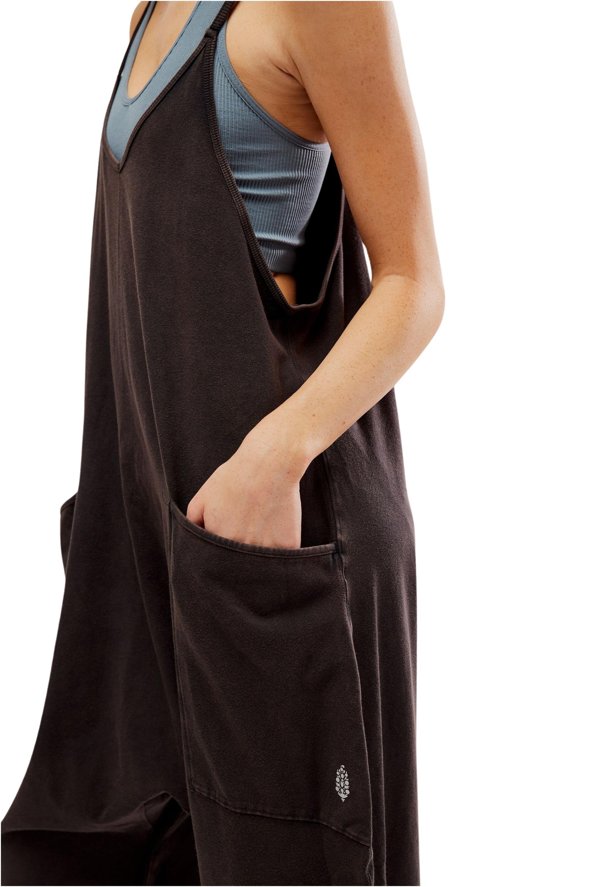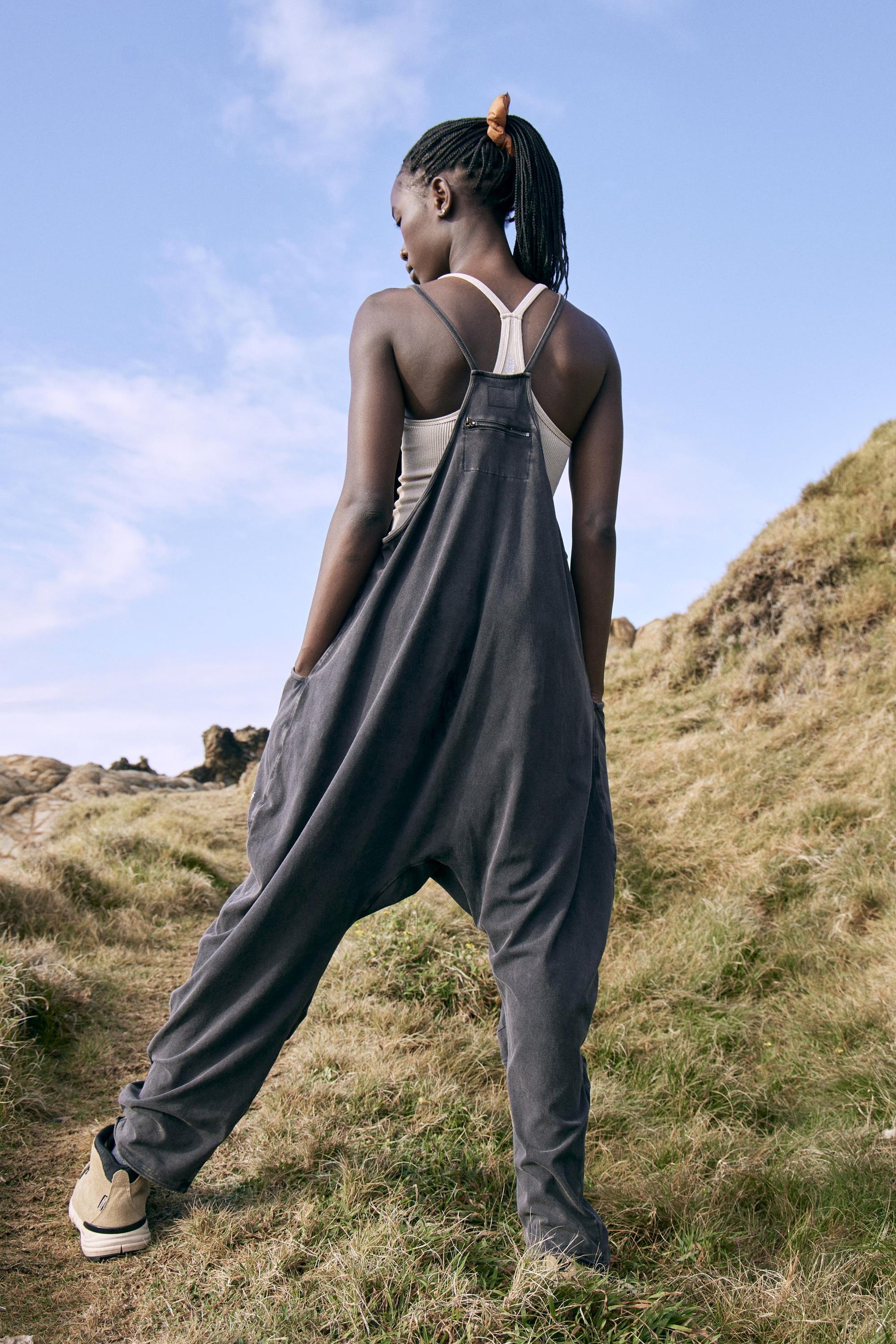 - Racerback silhouette, oversized patch pockets, dropped armholes