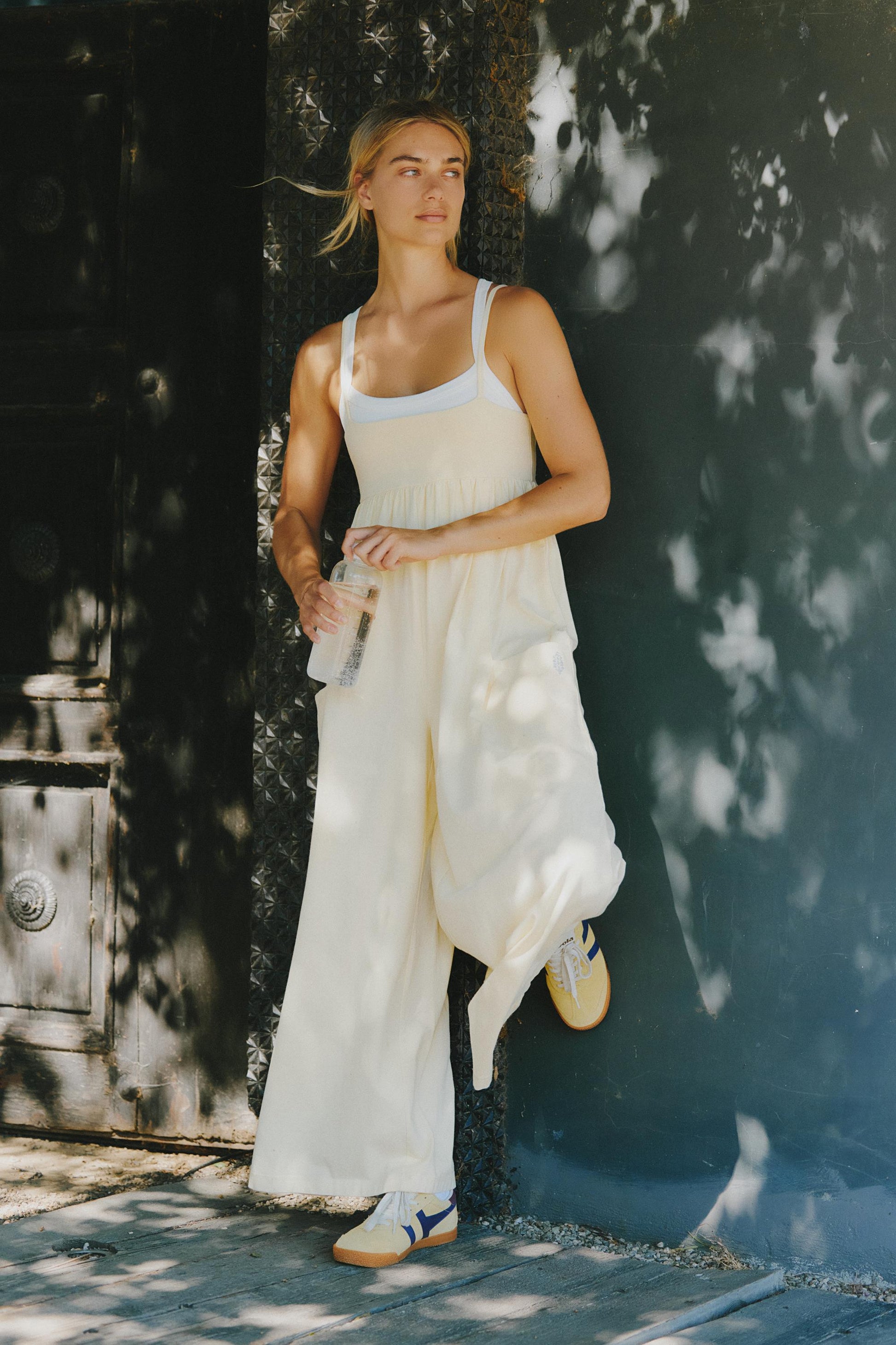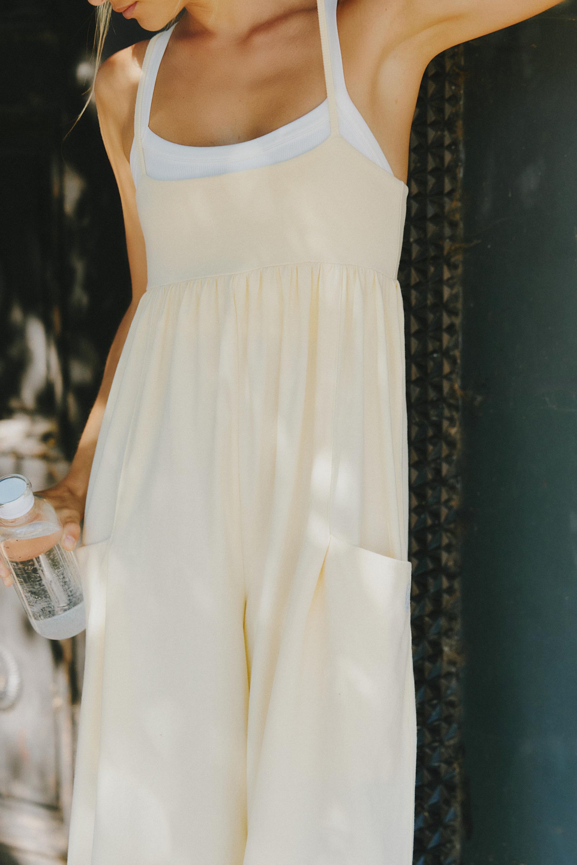 - Add the cutest style to your one-piece collection with this effortless jumpsuit featuring a square neckline, wide legs, and pleating throughout for a babydoll-inspired design.