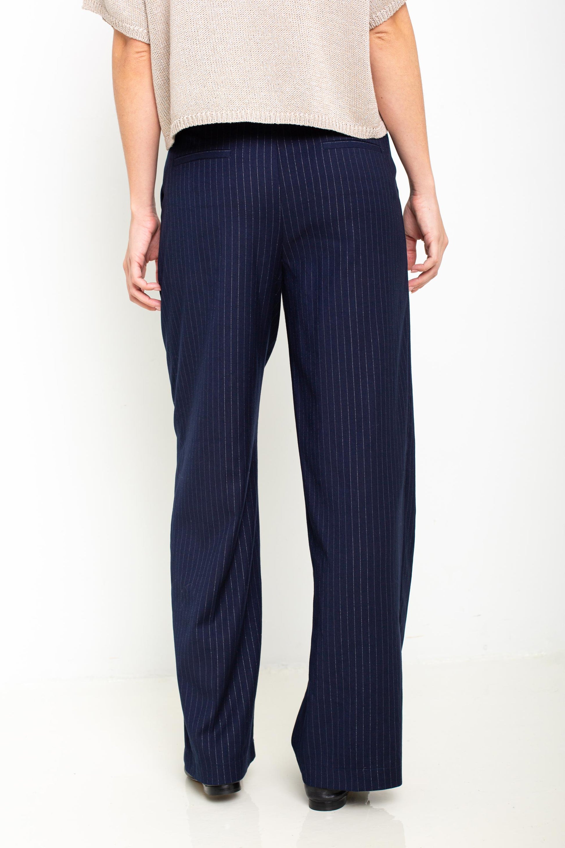 - The trousers are designed with vertical stripes that add a sleek, elongating effect to the silhouette while the metallic threads catch the light, adding a hint of glamour.