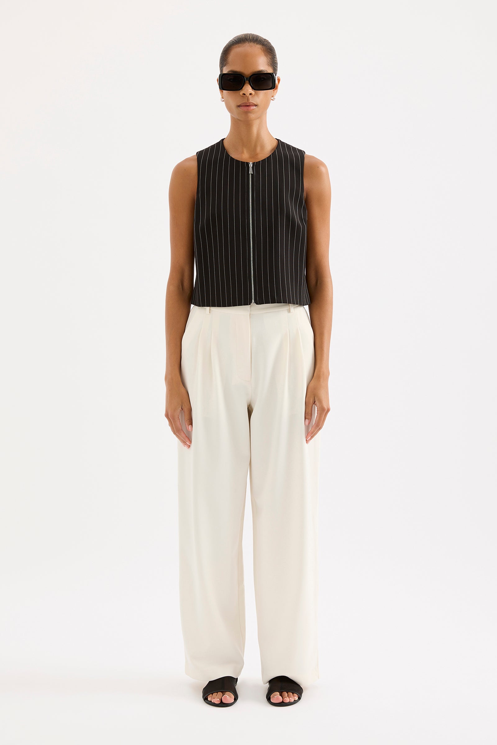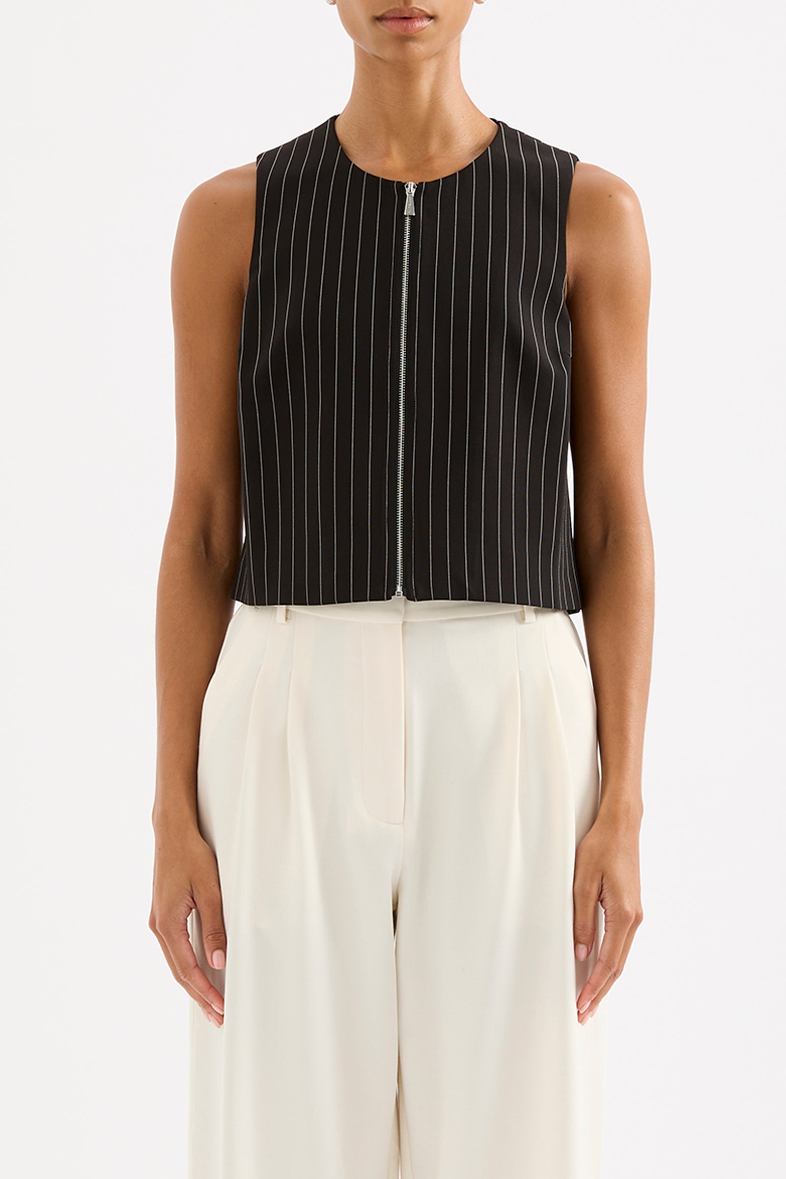 - The Maeve Pinstripe Vest is made from a midweight tailoring fabric which has a smooth hand feel. The silhouette is comfortable and cropped, finishing at the waist. Features include a crew neckline and a center front zipper opening with branded zipper puller.