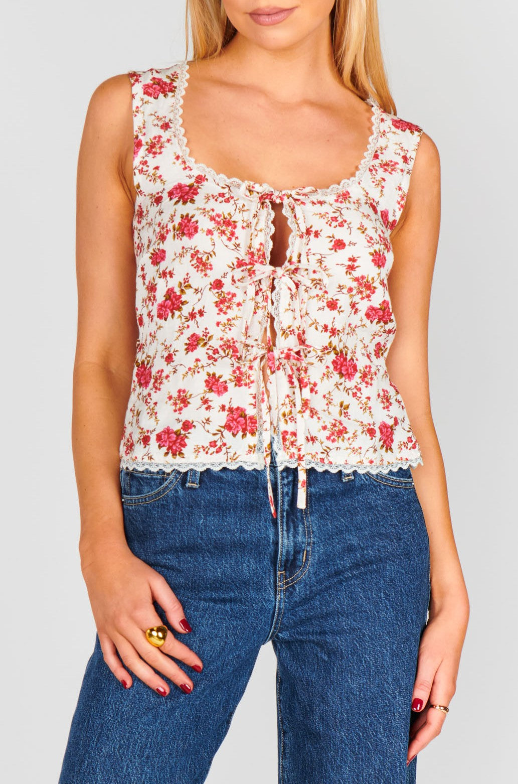 - Effortlessly femme, this tank features a slim silhouette, delicate lace trim, and adjustable tie details. A waist-cinching belt at the back adds the perfect touch for a flattering fit. Wear it with denim for a laid-back look and boots when you’re feeling a little more western!