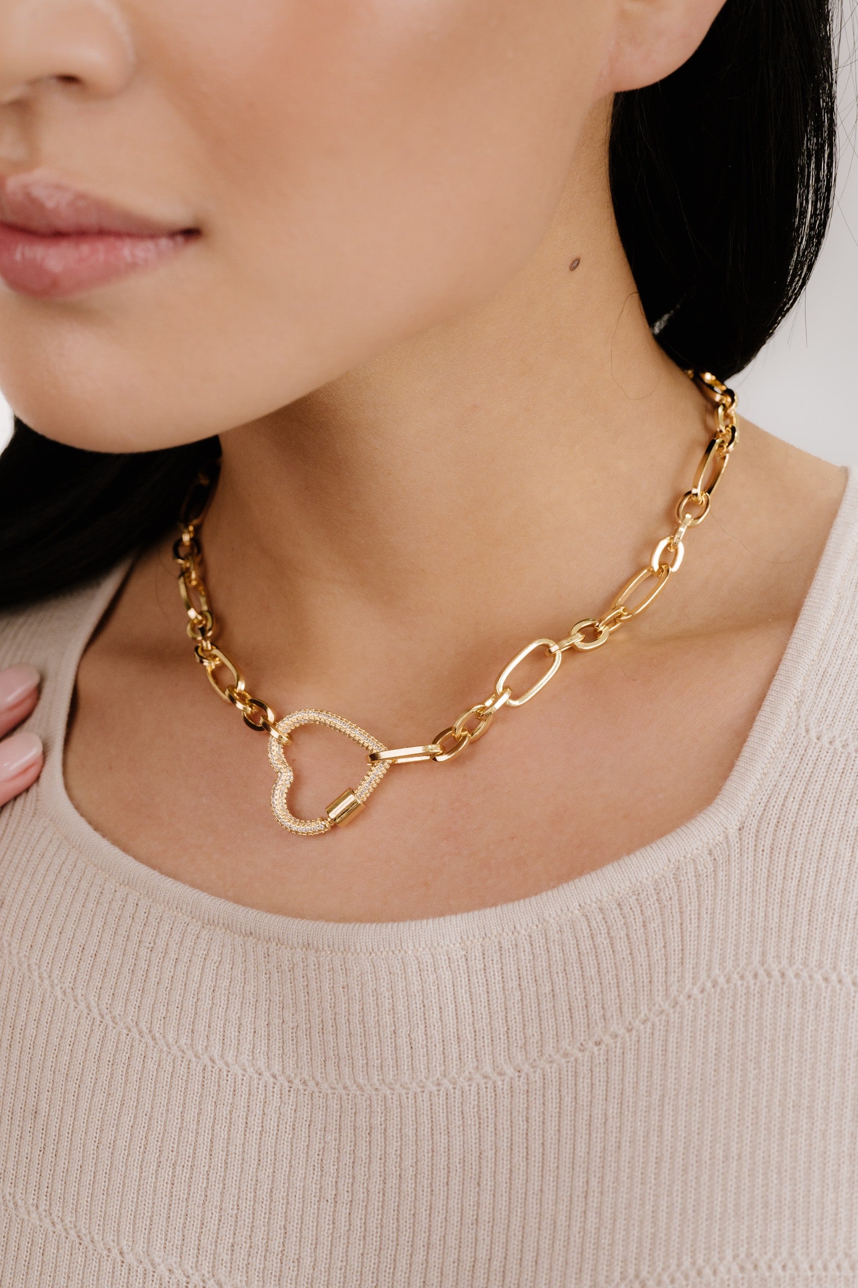 - The Open Heart Lock Necklace is a bold yet romantic statement piece. Crafted with lustrous 18k gold plating, it features a radiant heart-shaped clasp that anchors an oversized link chain. Perfect on its own or layered, it adds a touch of shine and sentiment to any look.