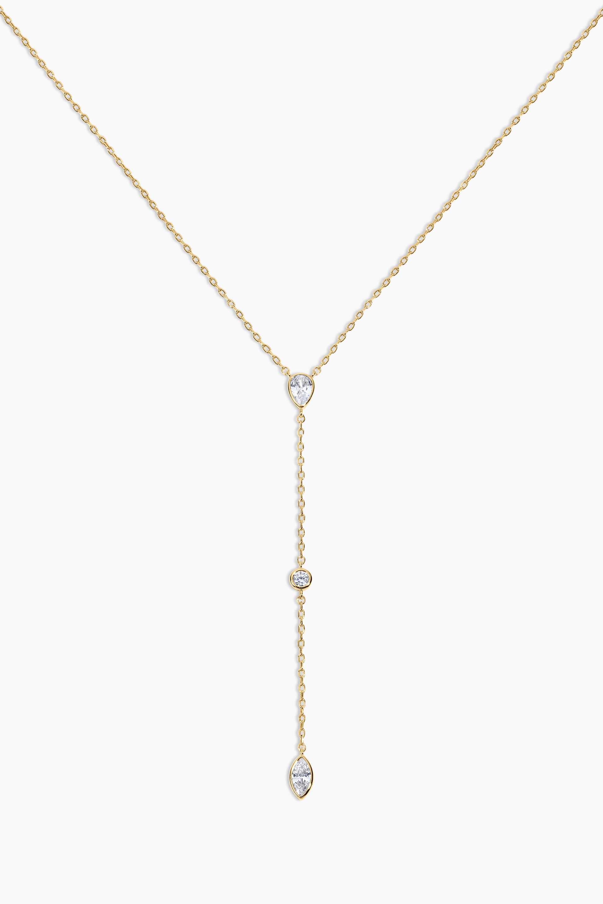- Paloma Necklace is the perfect accessory for adding a delicate drop of elegance. This lariat necklace drapes gracefully featuring a trio of three sparking stones on a minimalist gold chain.