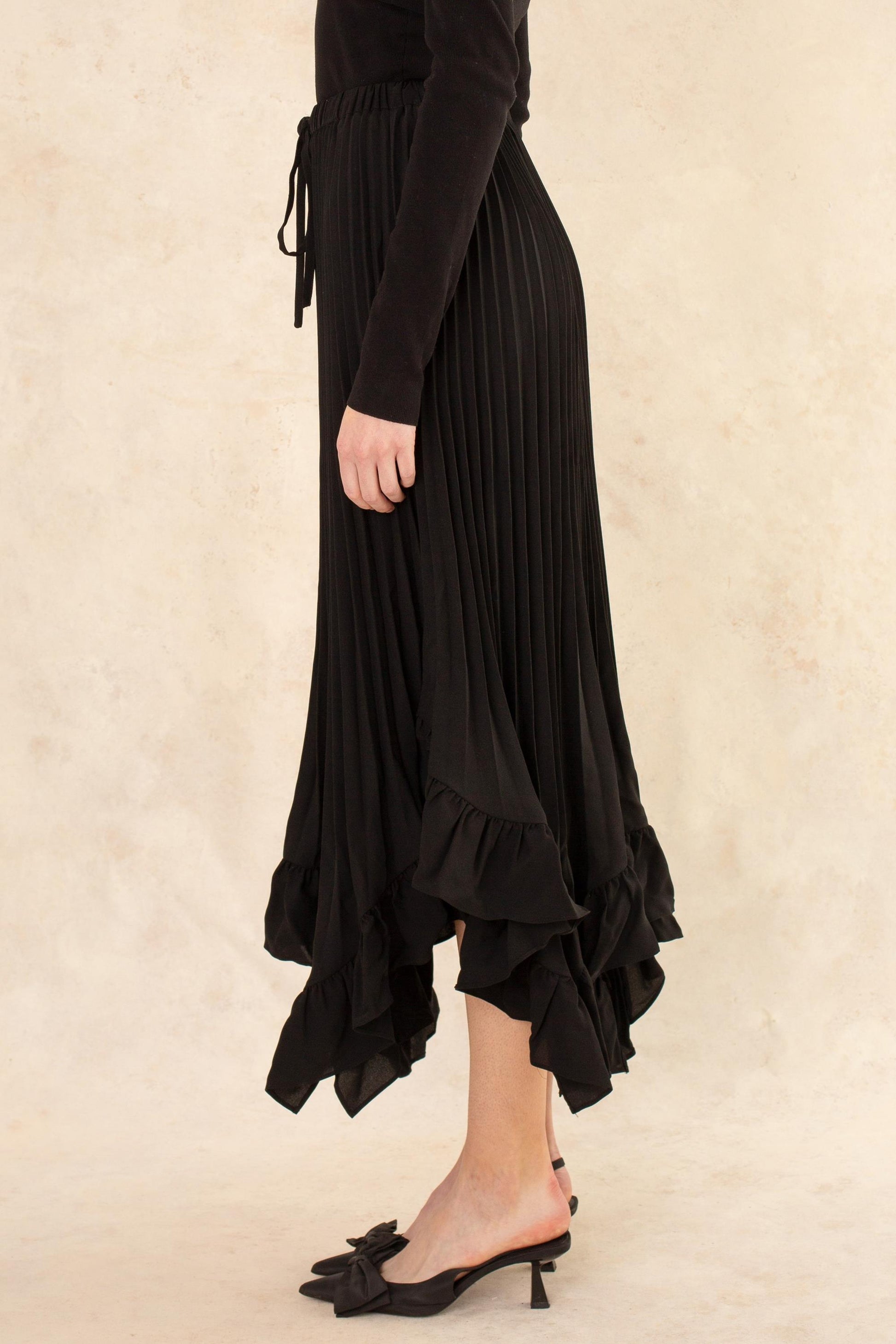 - The most unique feature is the asymmetrical, tiered, and ruffled hemline. The bottom edge has gathered or ruffled layers that create movement and volume. The hem is irregular, with jagged or pointed pieces of fabric extending below the ruffle, giving it a dramatic, handkerchief-style or high-low effect. This provides glimpses of the lower leg.