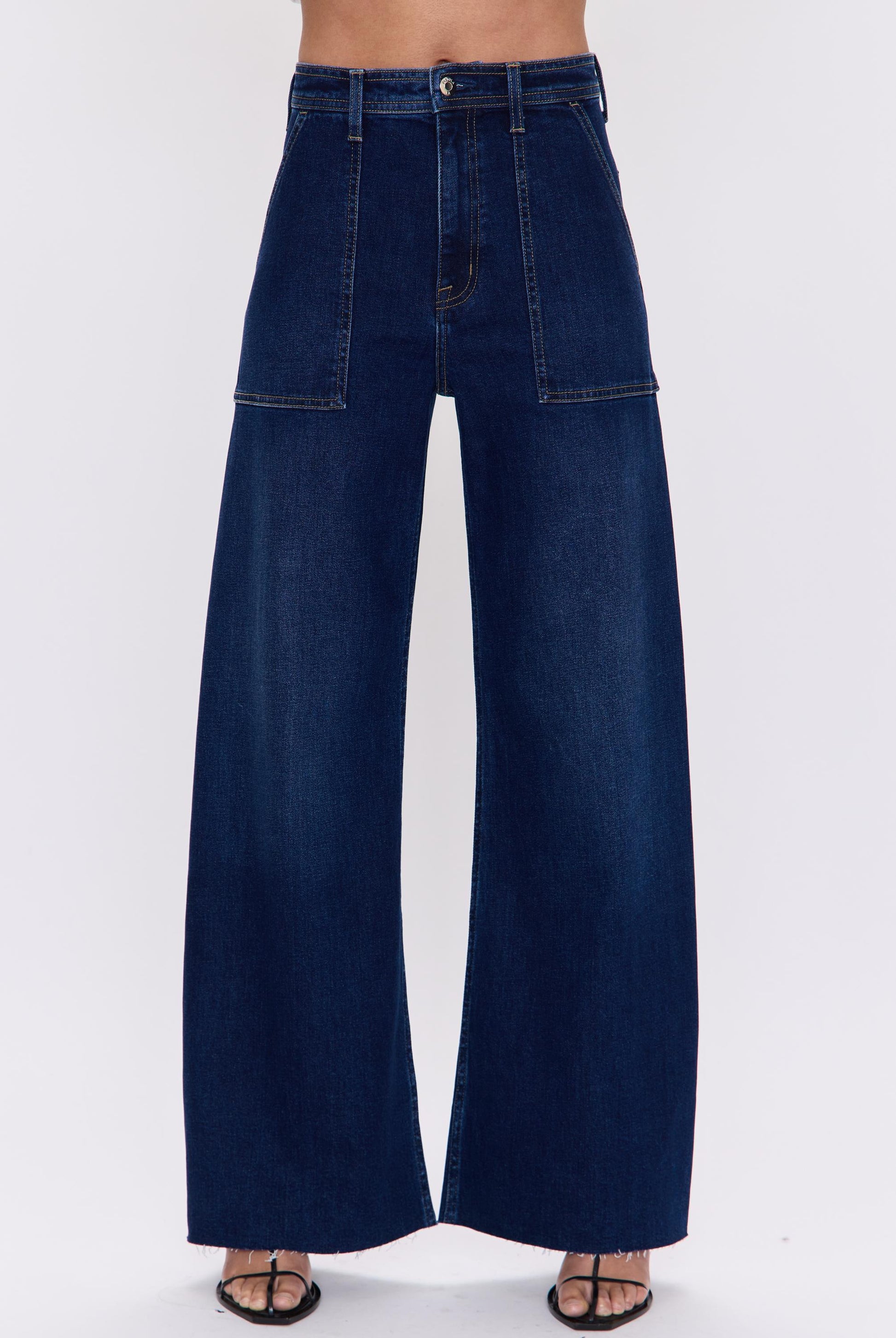 - The Penny high rise waist, with a wide leg silhouette, front patch pockets and a full length raw hemline. Crafted in comfort stretch denim, Calluna is a dark washed denim with utility style patch pockets.