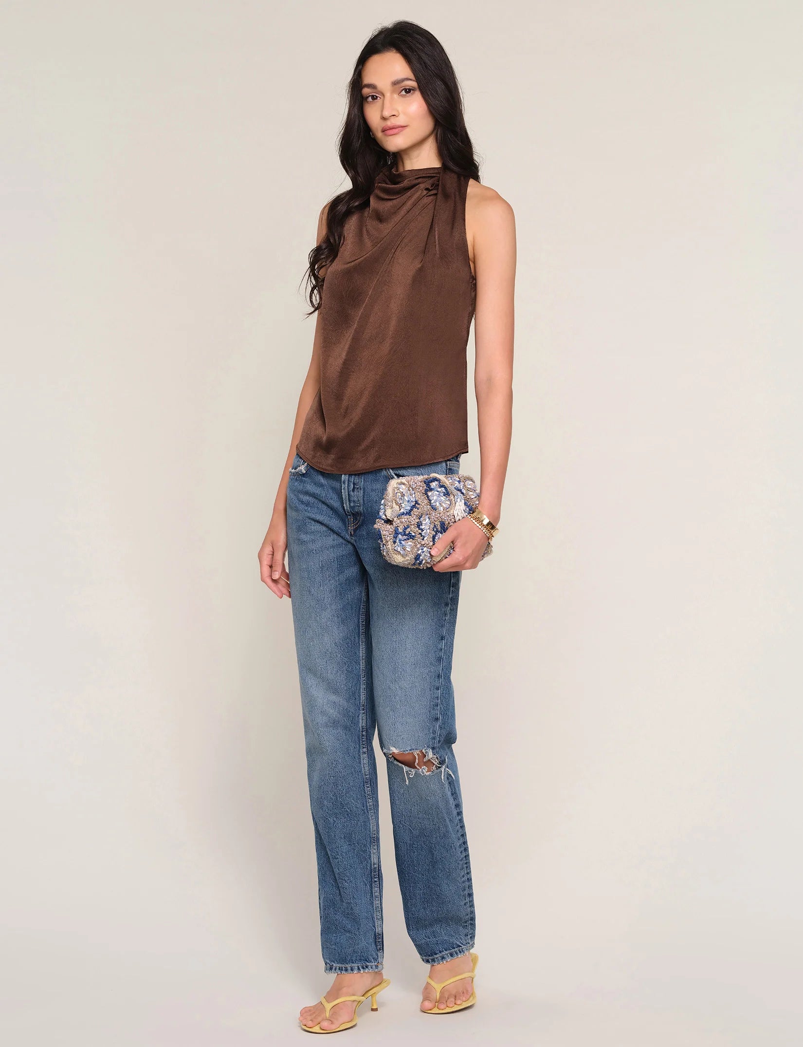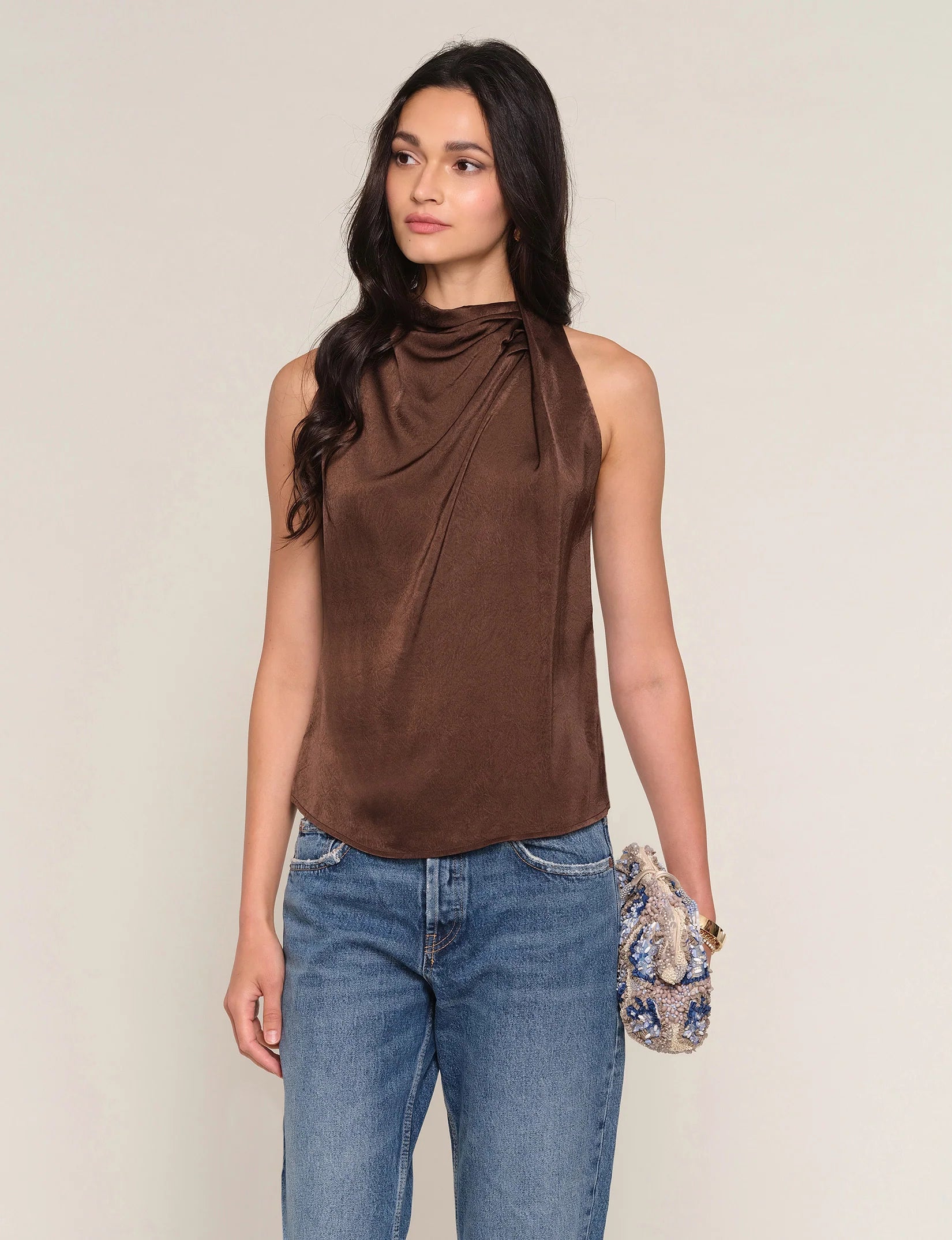 - The Remonia Top is a soft, hammered satin blouse, with a draped neck. It has a relaxed fit, perfect for tucking into jeans.