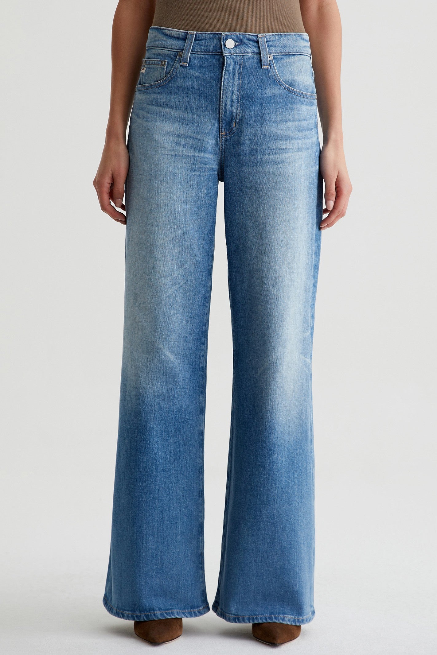 - Our Saige Wide Leg features a mid-rise waist and loose, full length legs. Designed in 11 oz. stretch-blend Journey Denim from Italy, these five-pocket jeans are finished in an AG-ed™ medium wash that replicates 18 years of wear.