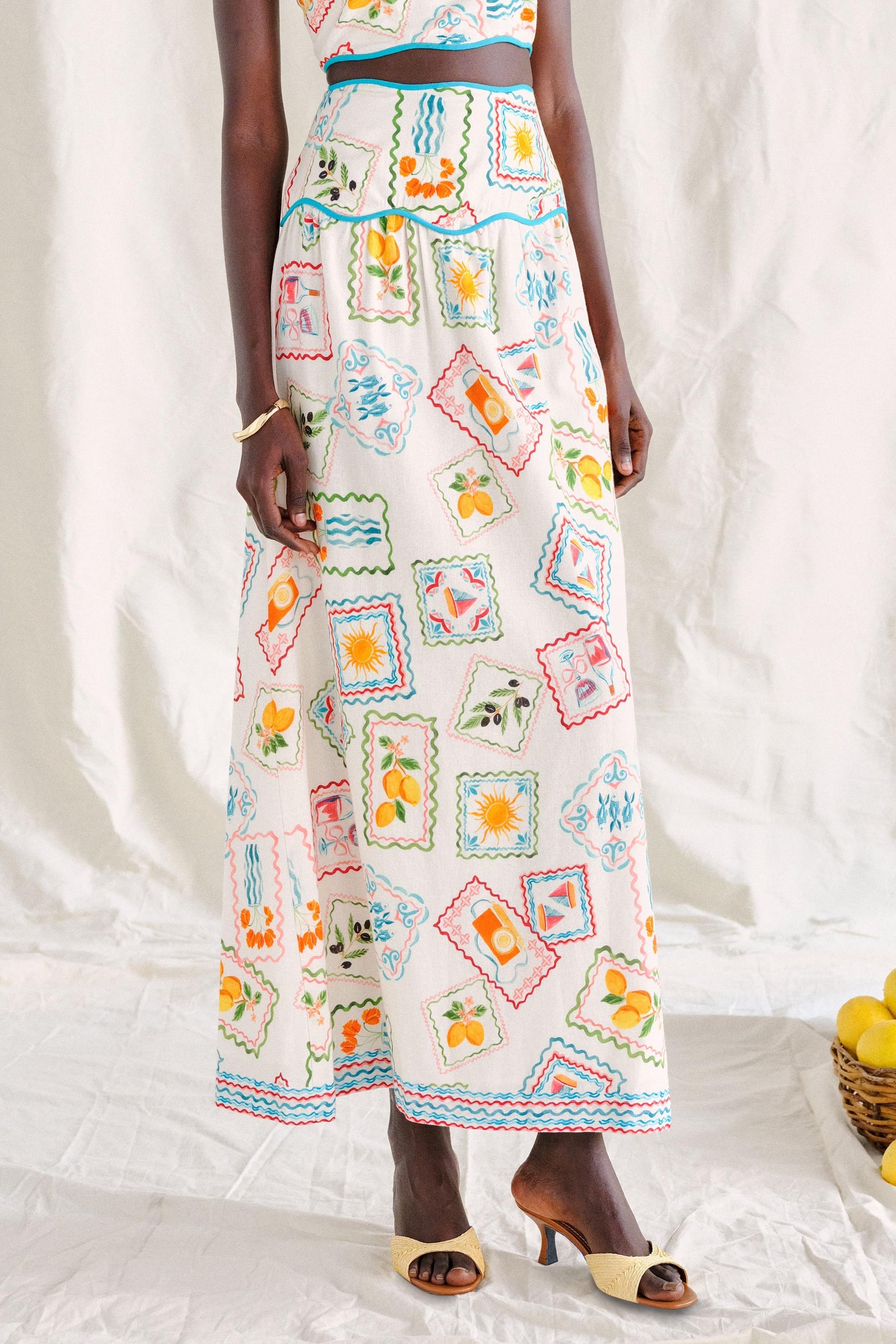 - Add a stamp in your passport and stamps in your wardrobe! Our Tashi set is the perfect pair for a getaway, the top and midi skirt set are made from a stamp printed linen. The cotton/linen blend fabric, keep Tashi soft and breathable. The bra style top and midi skirt have matching scallop hems for extra cuteness. Get ready to book your next vacay with Tashi.
