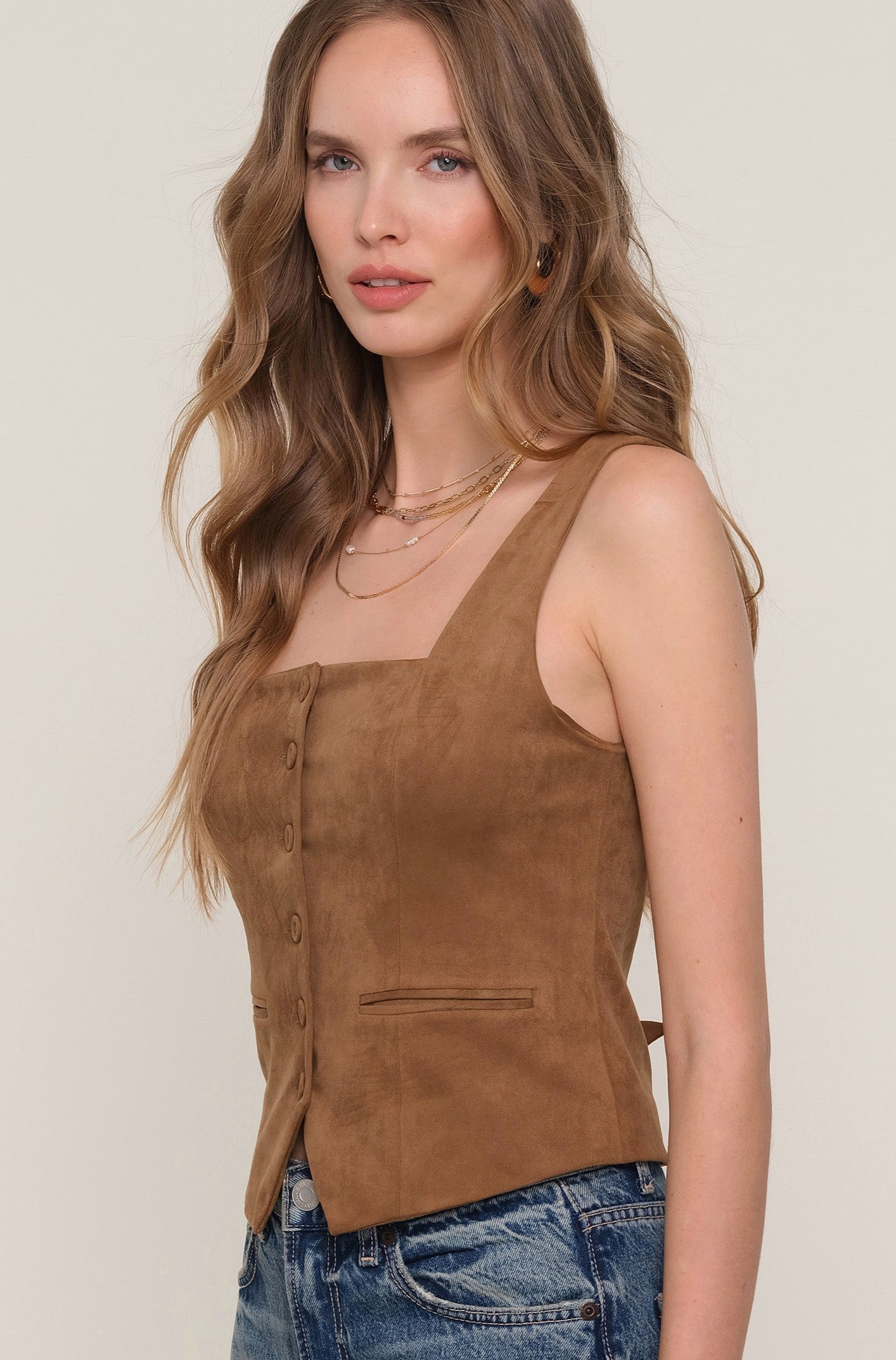 - The Terra Vest is a faux suede top with a really flattering fit. It features a square neckline and a button front closure.