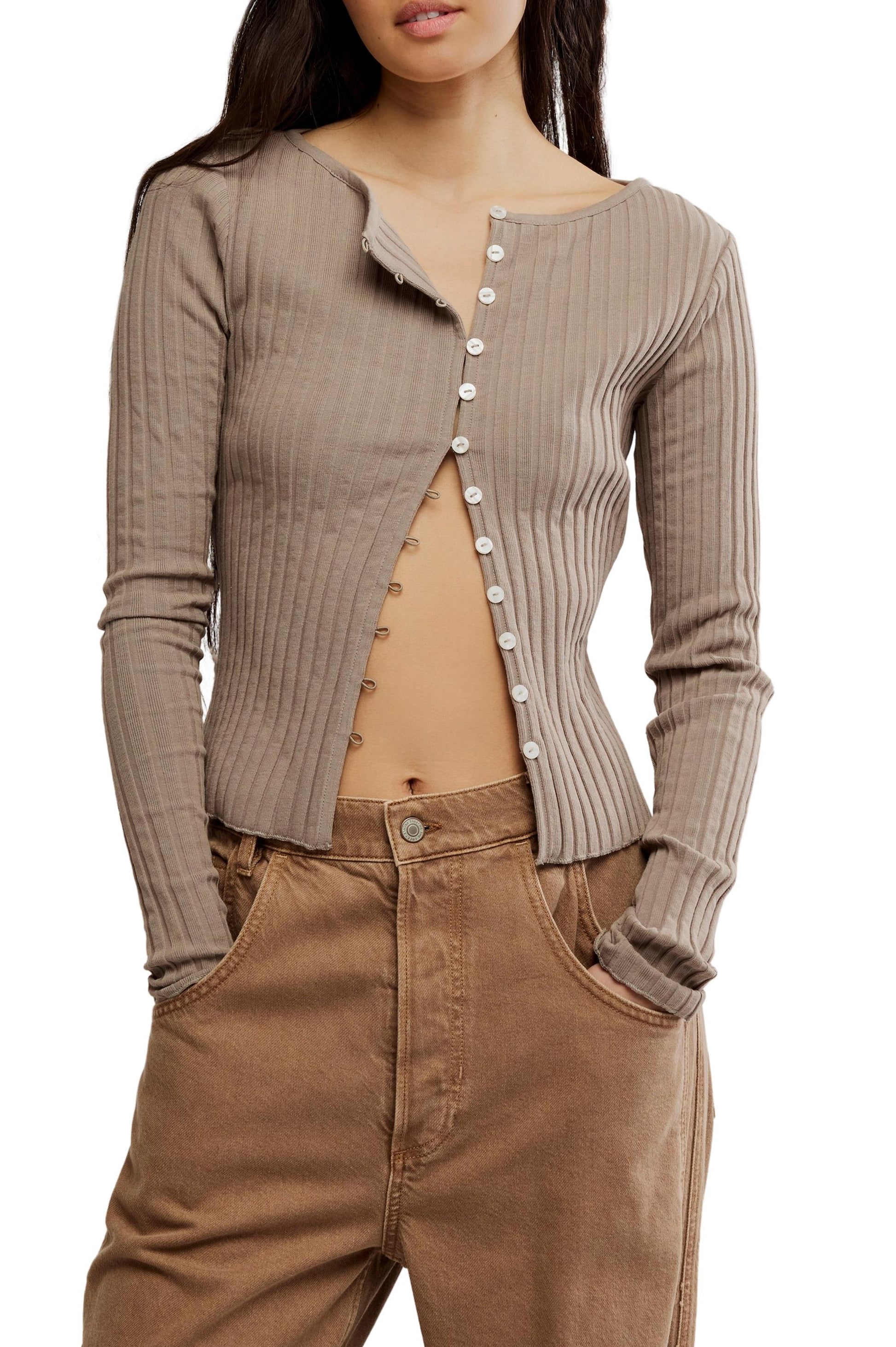 - So simple, this timeless top features a ribbed fabrication and slim-fitting silhouette with button closures and long-sleeves.