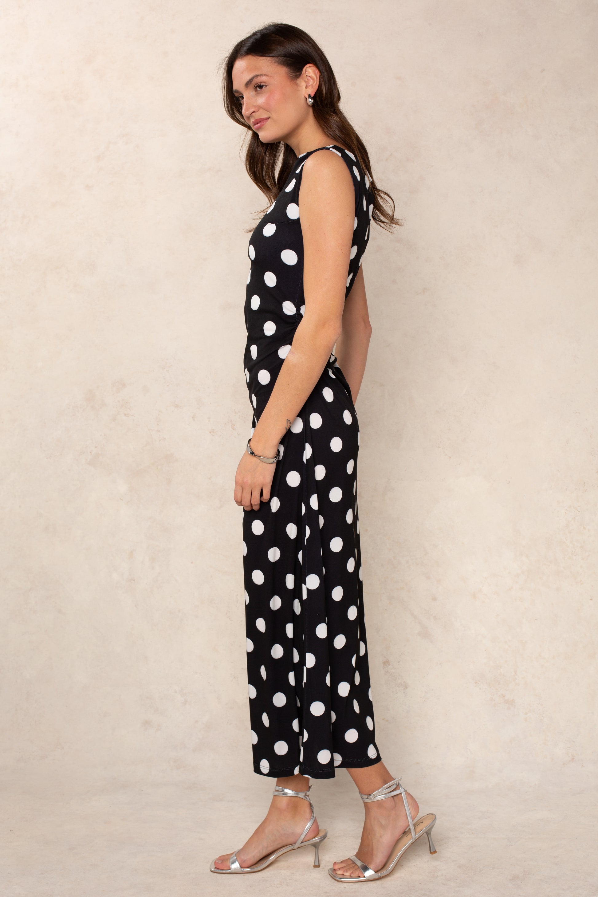 This sleeveless black maxi dress features a classic all-over white polka dot print, offering a timeless and elegant aesthetic.