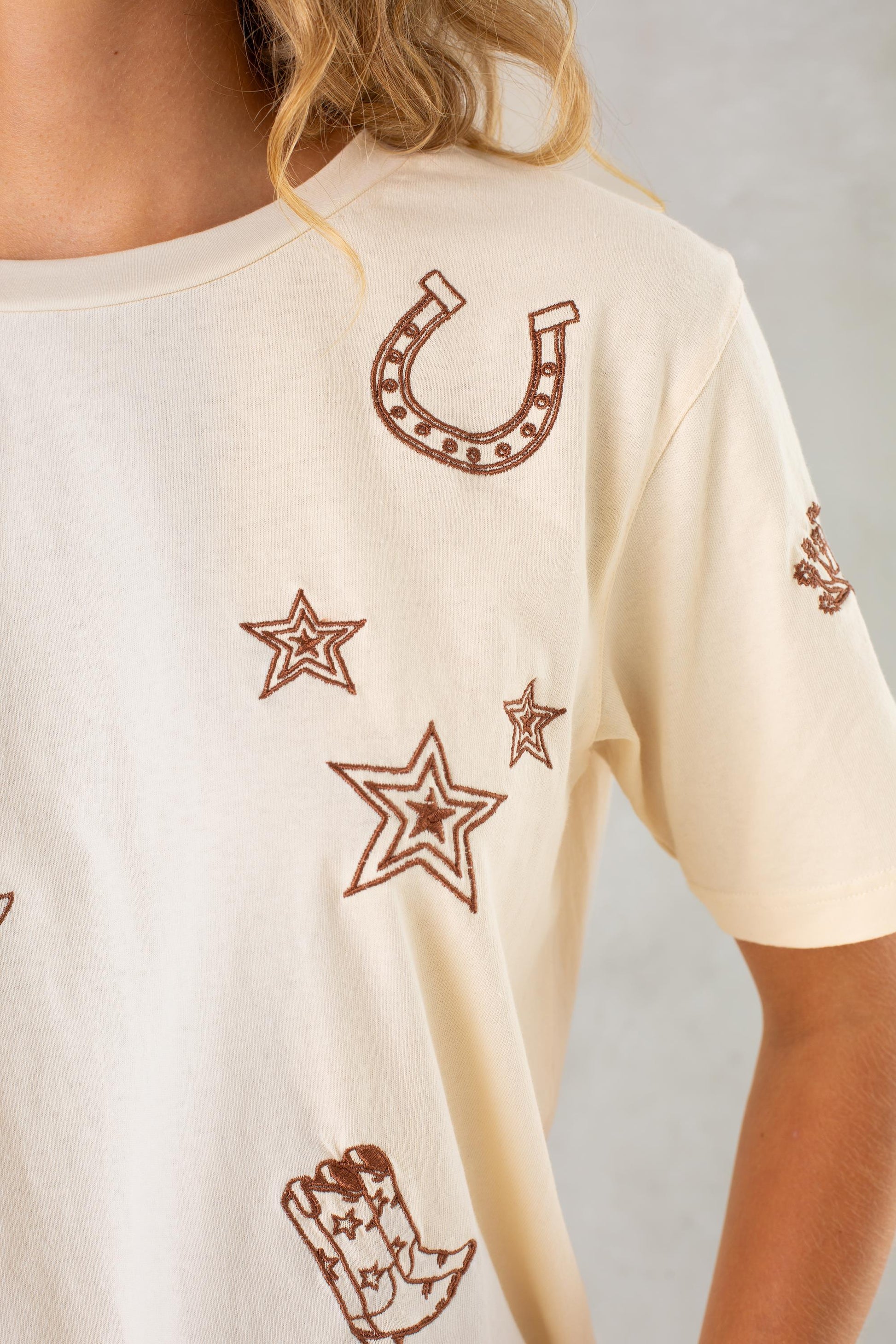 - This oversized, relaxed-fit tee is all about laid-back charm with a twist—featuring intricate embroidered western details that add a touch of character to your everyday staple.