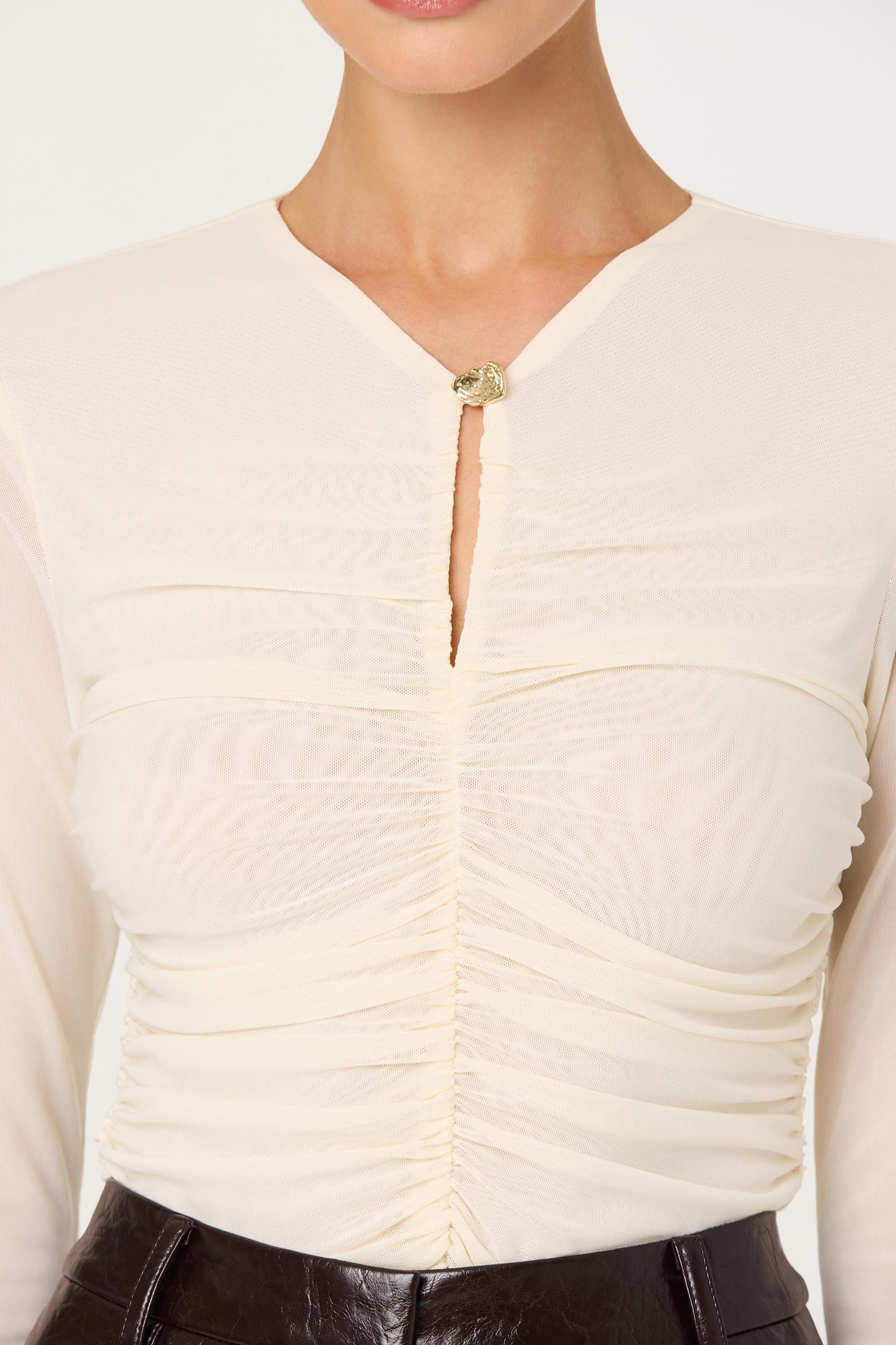 - Ruched mesh knit top;